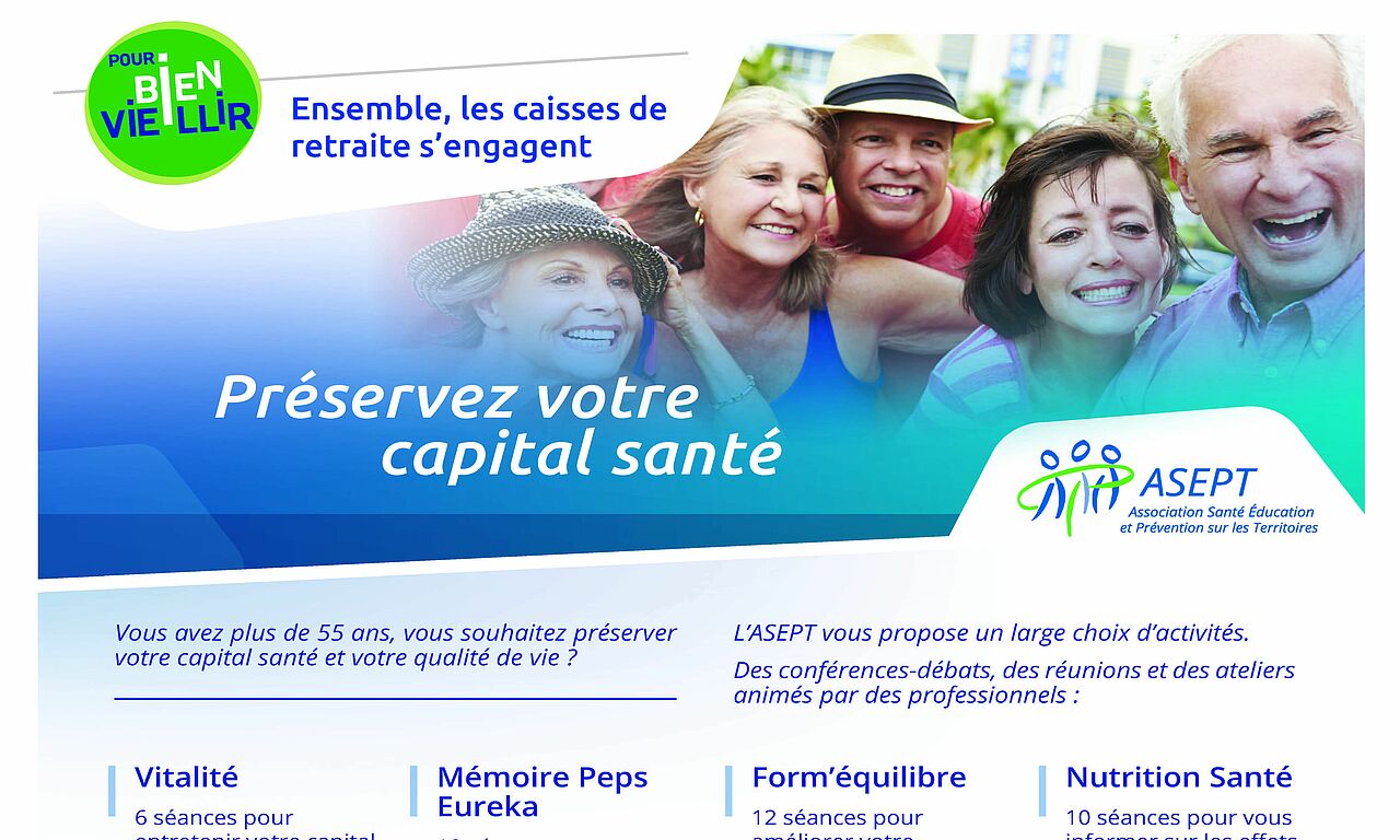 Ouvert à tous à partir de 55 ans, quel que soit votre régime de retraite. Gratuit et proche de chez vous, découvrez notre programme sur : https://www.asept-perigord-agenais.fr/