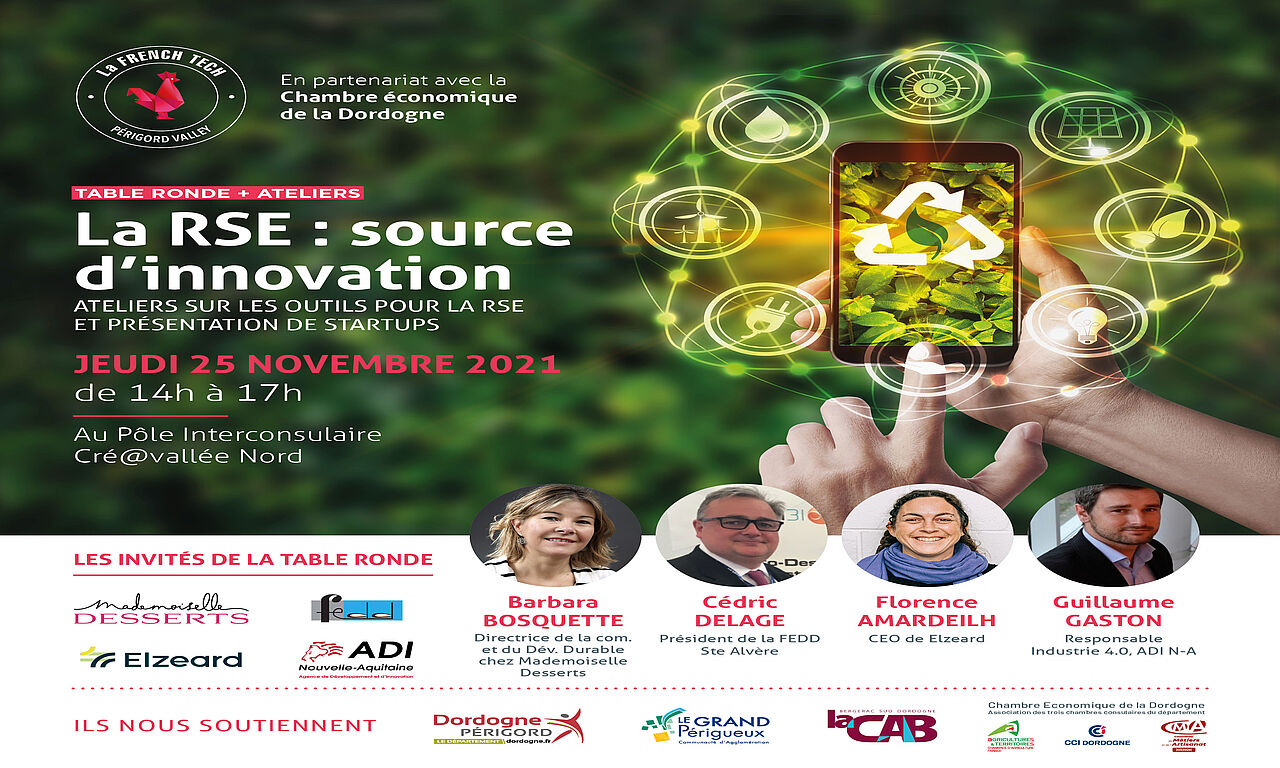 Une rencontre sur la thématique de l’innovation au service de la Responsabilité sociale des entreprises, c'est ce que propose la French Tech Périgord Valley, en partenariat avec la Chambre économique de la Dordogne jeudi 25 novembre de 14h à 17h au Pôle interconsulaire.