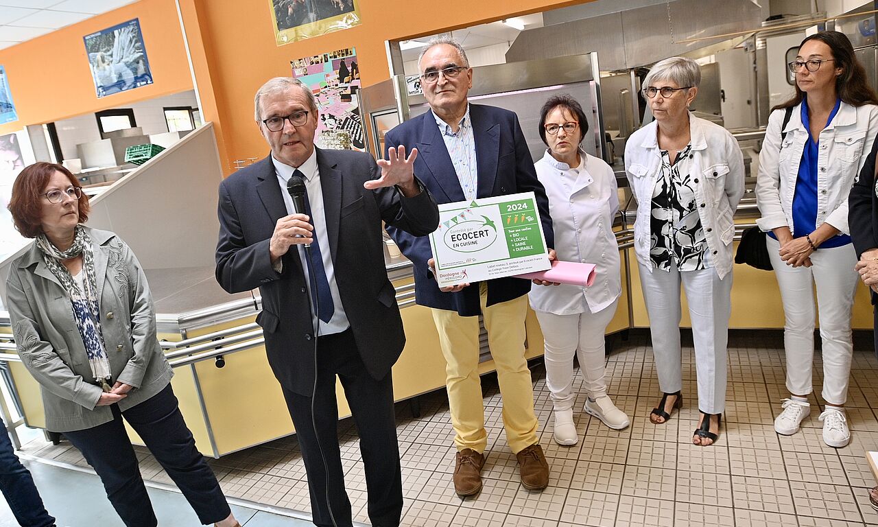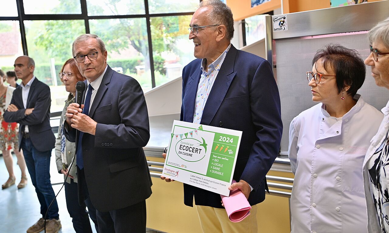 L’année scolaire 2023-2024 a été marquée par la labellisation de 5 nouveaux collèges "en Cuisine 100% bio, local, fait maison et de saison" par l’organisme Ecocert : Léo Testut à Beaumontois-en-Périgord, Charles de Gaulle à La Coquille, Jean Monnet à Lalinde, Jules Ferry à Terrasson-Lavilledieu et Yvon Delbos à Montignac-Lascaux, qui a reçu son label le jour de la rentrée scolaire.