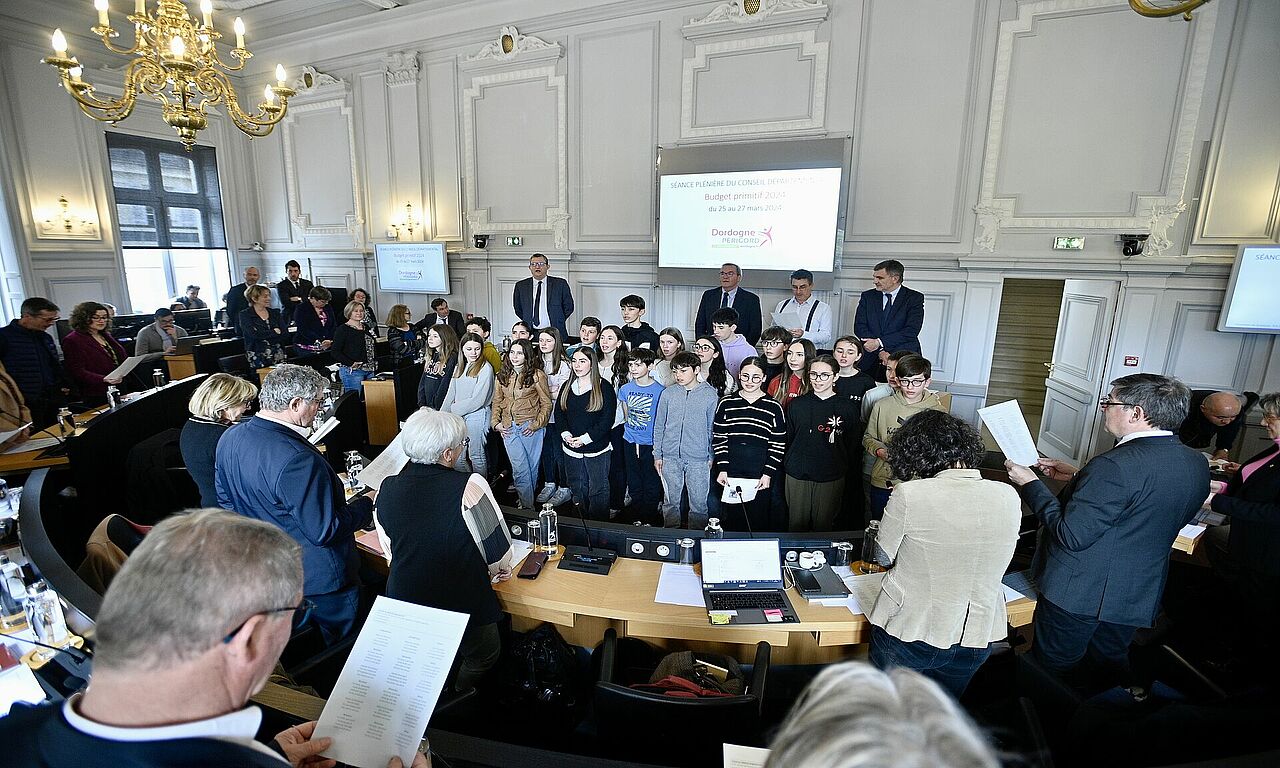 En ouverture de session plénière consacrée au budget primitif, les élus ont entonné le « Se Canta », hymne occitan, accompagnés par les élèves option occitan de 4e du collège Bertran de Born.