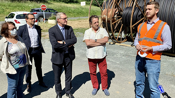 Accompagné des conseillers départementaux du territoire, Bruno Lamonerie et Annie Sedan, Germinal Peiro, en qualité de président de Périgord Numérique, s’est rendu ce mardi 26 mai, à St Germain des Prés, sur le chantier de construction, en micro-tranchée, d’un lien de fibre optique du réseau de collecte entre Thiviers et Excideuil.