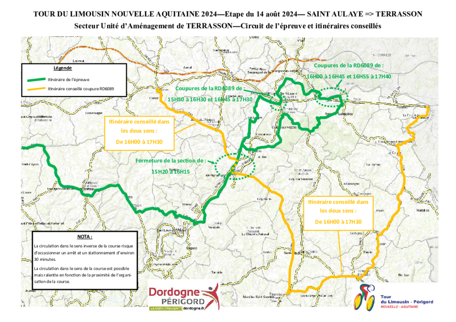 Enfin, à noter que dans le secteur du Lardin-Saint-Lazare, des coupures de la RD6089 sont prévues entre 15h50 et 16h30 et entre 16h45 et 17h30. Dans le secteur de Terrasson-Lavilledieu, la RD6089 sera fermée de 16h à 16h45 et de 16h55 à 17h40.